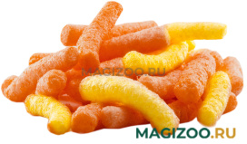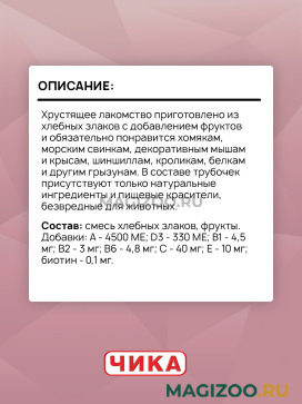 Хрустящее лакомство приготовлено из хлебных злаков с добавлением фруктов и обязательно понравится хомякам, морским свинкам, декоративным мышам и крысам, шиншиллам, кроликам, белкам и другим грызунам. В составе трубочек присутствуют только натуральные ингредиенты и пищевые красители, безвредные для животных.