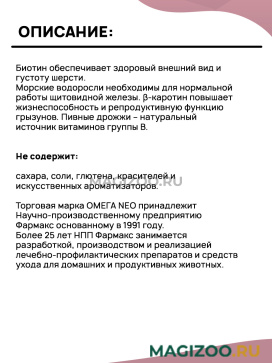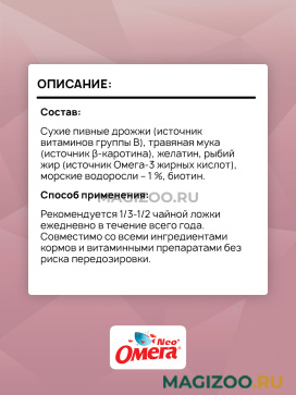 - Лакомство Омега Neo+ изготавливается на основе натуральных ингредиентов: пивных дрожжей с добавлением морских водорослей и Омега-3 кислот.