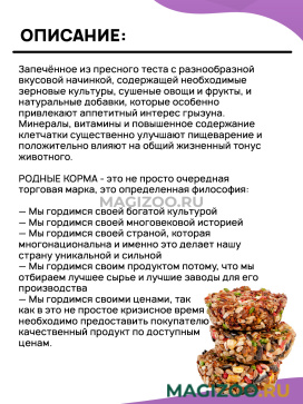 - Запечённое из пресного теста с разнообразной вкусовой начинкой, содержащей необходимые зерновые культуры, сушеные овощи и фрукты, и натуральные добавки, которые особенно привлекают аппетитный интерес грызуна.
