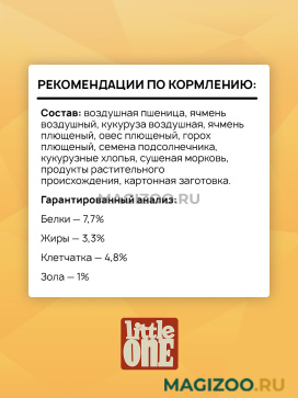 Информация о составе и ингредиентах, цветовом решении, технических и иных характеристиках, стране-изготовителе, внешнем виде и комплекте поставки товара носит справочный характер и основана на последних доступных к моменту публикации сведениях. Доставка данного товара осуществляется во все регионы РФ.Продукция бренда Little One – это 100% натуральные продукты питания и товары для ухода за декоративными животными, которые разработаны с учетом индивидуальных особенностей, пищевых потребностей и вкусовых предпочтений питомцев.