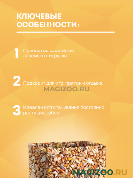Хрустящее лакомство-игрушка предназначено для ухода за постоянно растущими зубами, развлечет и займет питомца на продолжительное время, станет идеальным местом для игр и даже сна.