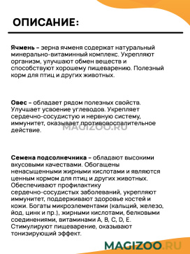 Ячмень – зерна ячменя содержат натуральный минерально-витаминный комплекс. Укрепляют организм, улучшают обмен веществ и способствуют хорошему пищеварению. Полезный корм для птиц и других животных.