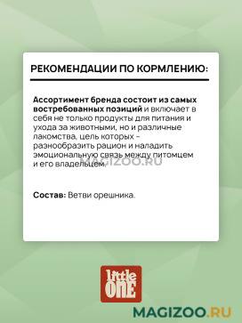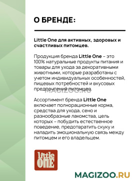 Продукция бренда Little One – это 100% натуральные продукты питания и товары для ухода за декоративными животными, которые разработаны с учетом индивидуальных особенностей, пищевых потребностей и вкусовых предпочтений питомцев.