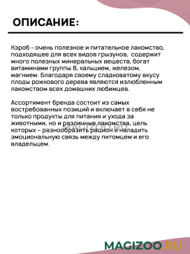 Кэроб - очень полезное и питательное лакомство, подходящее для всех видов грызунов, содержит много полезных минеральных веществ, богат витаминами группы В, кальцием, железом, магнием. Благодаря своему сладковатому вкусу плоды рожкового дерева являются излюбленным лакомством всех домашних любимцев.