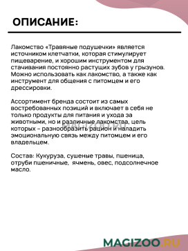 Лакомство «Травяные подушечки» является источником клетчатки, которая стимулирует пищеварение, и хорошим инструментом для стачивания постоянно растущих зубов у грызунов. Можно использовать как лакомство, а также как инструмент для общения с питомцем и его дрессировки.