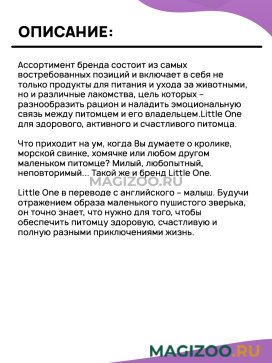 Информация о составе и ингредиентах, цветовом решении, технических и иных характеристиках, стране-изготовителе, внешнем виде и комплекте поставки товара носит справочный характер и основана на последних доступных к моменту публикации сведениях. Доставка данного товара осуществляется во все регионы РФ.Продукция бренда Little One – это 100% натуральные продукты питания и товары для ухода за декоративными животными, которые разработаны с учетом индивидуальных особенностей, пищевых потребностей и вкусовых предпочтений питомцев.