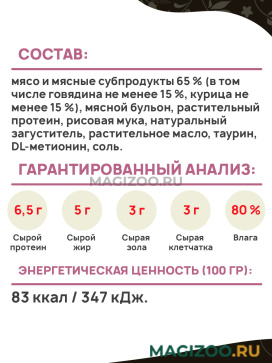 Состав: мясо и мясные субпродукты 65 % (в том числе говядина не менее 15 %, курица не менее 15 %), мясной бульон, растительный протеин, рисовая мука, натуральный загуститель, растительное масло, таурин, DL-метионин, соль.