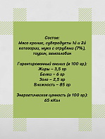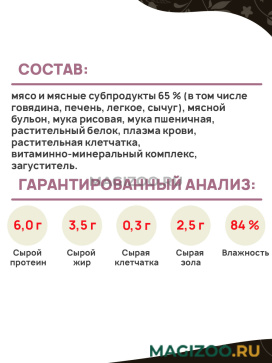Состав: мясо и мясные субпродукты 65 % (в том числе говядина, печень, легкое, сычуг), мясной бульон, мука рисовая, мука пшеничная, растительный белок, плазма крови, растительная клетчатка, витаминно-минеральный комплекс, загуститель.