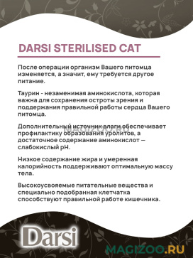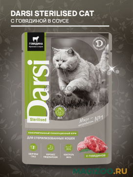 Полноценный сбалансированный рацион для взрослых кастрированных котов и стерилизованных кошек DARSI STERILISED – это вкусный и полезный обед с кусочками говядины в аппетитном соусе для Вашего питомца!