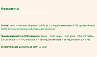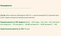 Состав: мясо и мясные субпродукты 80% (в т.ч. кролик минимум 5%), сушеный горох (2,5%), таурин, витаминно-минеральный комплекс.