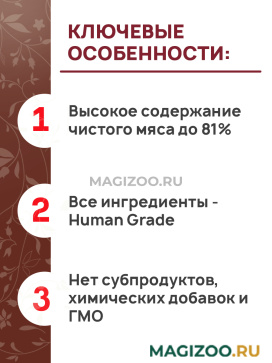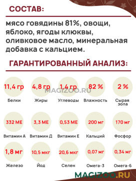 Состав: мясо говядины 81%, овощи, яблоко, ягоды клюквы, оливковое масло, минеральная добавка с кальцием.