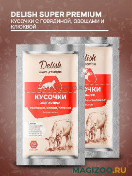 Полнорационный влажный корм Delish Super Premium для кошек с кусочками говядины, овощами и клюквой.