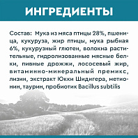 Мука из мяса курицы 28%, пшеница, кукуруза, жир птицы, мука рыбная 6%, кукурузный глютен, волокна растительные, гидролизованные мясные белки, пивные дрожжи, лососёвый жир, витаминно-минеральный премикс, лизин, экстракт юкки, метионин, таурин, пробиотик Bacillus subtilis
