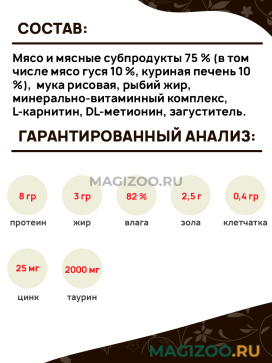 Мясо и мясные субпродукты 75 % (в том числе мясо гуся 10 %, куриная печень 10 %), мука рисовая, рыбий жир, минерально-витаминный комплекс, L-карнитин, DL-метионин, загуститель.