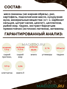 Состав: мясо свинины (не жирная обрезь), рис, картофель, подсолнечное масло, кукурузная мука, минеральные вещества ( в т. ч. карбонат кальция, цитрат калия, цеолит), целлюлоза, рыбий жир, таурин, экстракт бархатцев прямостоячих (источник лютеина), витамины.