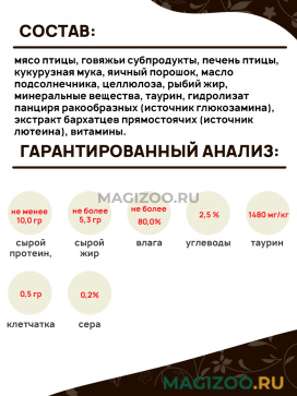 Состав: мясо птицы, говяжьи субпродукты, печень птицы, кукурузная мука, яичный порошок, масло подсолнечника, целлюлоза, рыбий жир, минеральные вещества, таурин, гидролизат панциря ракообразных (источник глюкозамина), экстракт бархатцев прямостоячих (источник лютеина), витамины.