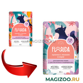Полноценный влажный корм FLORIDA для взрослых кошек с чувствительным пищеварением от 1 до 8 лет с кусочками сочного лосося в соусе.