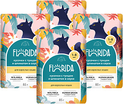 Полноценный влажный корм FLORIDA для взрослых кастрированных котов и стерилизованных кошек с кусочками сочной индейки в соусе.