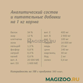 Пищевые добавки (на 1 кг): витамин A - 20 000 МЕ, витамин D3 - 1 600 МЕ, витамин E - 400 мг, витамины группы В - 2900 мг, витамин C - 100 мг, таурин - 16000 мг, медь (сульфат меди пентагидрат) - 15 мг, цинк (сульфат цинка моногидрат) - 140 мг, марганец (сульфат марганца моногидрат) - 30 мг, йод (йодат кальция) - 2 мг, селен (селенит натрия) - 0,4 мг.