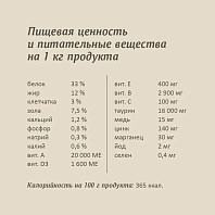 Пищевые добавки (на 1 кг): витамин A 20 000 МЕ, витамин D3 1 600 МЕ, витамин E 400 мг, витамины группы В 2900 мг, витамин C 100 мг, таурин 16000 мг, медь (сульфат меди пентагидрат) 15 мг, цинк (сульфат цинка моногидрат) 140 мг, марганец (сульфат марганца моногидрат) 30 мг, йод (йодат кальция) 2 мг, селен (селенит натрия) 0,4 мг.