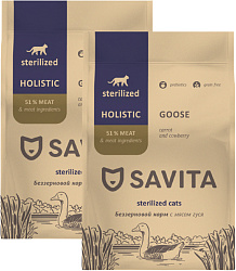 Сухой корм SAVITA STERILISED CATS GOOSE класса холистик содержит высокий процент мясных ингредиентов, необходимых витаминов и минералов, без добавления зерновых культур в составе. Надолго обеспечивает кошку необходимой энергией на весь день. Каждый ингредиент тщательно подобран в соответствии с природными потребностями питомца и является важным компонентом в рецептуре корма, минимизируя риск возникновения аллергических реакций.