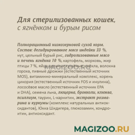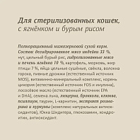 Полнорационный низкозерновой сухой корм для взрослых кастрированных котов и стерилизованных кошек с ягненком, бурым рисом, брокколи и клюквой.