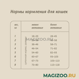 Корм вводить постепенно, в течение 5 дней смешивать с пищей, которую давали собаке ранее, после чего можно давать корм отдельно. Таблица по дневному рациону, представленная на упаковке, носит рекомендательный характер. Количество суточной нормы зависит от общего состояния, возраста и кондиции животного, а также от времени года.