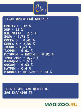 Производство корма происходит на заводах, где установлена самая современная техника, так что можно быть вполне уверенным, что Ваше животное получит превосходную пищу. Все продукты, применяемые при изготовлении корма CLAN, подвергаются бережной обработке. Это позволяет сохранить в натуральных продуктах все полезные вещества и витамины, необходимые Вашему питомцу, чтобы он успешно рос и развивался. Находящиеся в корме вещества укрепляют иммунную систему животного. И немаловажно, что питомцу понравится вкус этого корма.