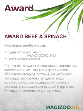 Влажный корм AWARD для взрослых кошек паштет из говядины со шпинатом.