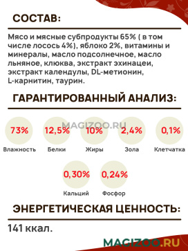 Мясо и мясные субпродукты 65% ( в том числе лосось 4%), яблоко 2%, витамины и минералы, масло подсолнечное, масло льняное, клюква, экстракт эхинацеи, экстракт календулы, DL-метионин, L-карнитин, таурин.