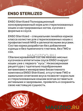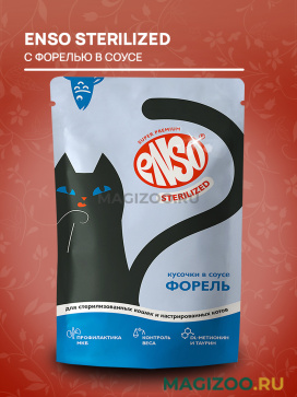 ENSO Sterilized Полнорационный консервированный корм для стерилизованных кошек и кастрированных котов, кусочки с форелью в соусе.