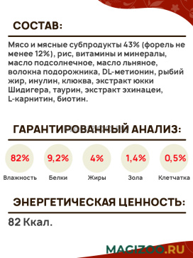 Мясо и мясные субпродукты 43% (форель не менее 12%), рис, витамины и минералы, масло подсолнечное, масло льняное, волокна подорожника, DL-метионин, рыбий жир, инулин, клюква, экстракт юкки Шидигера, таурин, экстракт эхинацеи, L-карнитин, биотин.