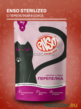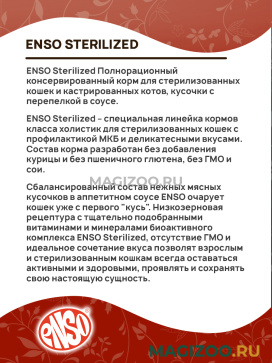 ENSO Sterilized Полнорационный консервированный корм для стерилизованных кошек и кастрированных котов, кусочки с перепелкой в соусе.