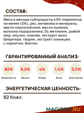 Мясо и мясные субпродукты 43% (перепелка не менее 12%), рис, витамины и минералы, масло подсолнечное, масло льняное, волокна подорожника, DL-метионин, рыбий жир, инулин, клюква, экстракт юкки Шидигера, таурин, экстракт эхинацеи, L-карнитин, биотин.