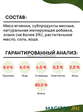 Мясо ягненка, субпродукты мясные, натуральная желирующая добавка, злаки (не более 2%), растительное масло, соль, вода.