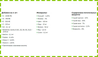 Минералы: кальций - 1,25%, фосфор - 1%, цинк - 100 мг, медь - 10 мг, железо - 50 мг, йод - 2,0 мг, селен - 0,1 мг.
