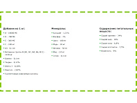 Минералы: кальций - 1,25%, фосфор - 1%, цинк - 100 мг, медь - 10 мг, железо - 50 мг, йод - 2,0 мг, селен - 0,1 мг.