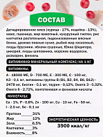 Дегидрированное мясо (курица - 17%, индейка - 13%), маис, пшеница, жир животный, кукурузный глютен, рис, клетчатка растительная, гидролизованные мясные белки, дрожжи пивные сухие, рыбий жир лососевый, плоды брусники, яблоки сушеные, юкка шидигера, цикорий, плоды шиповника, морские водоросли, розмарин, фенхель.
