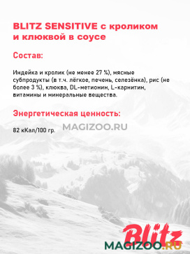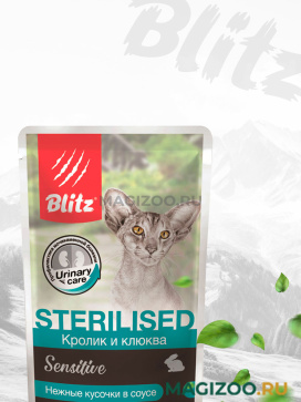 Нежнейшие мясные кусочки с крольчатиной и мясом индюшек, пропитанные ароматным соусом, вызовут аппетит у любого питомца, каким бы разборчивым он ни был. Возможно, вам даже придётся ловить на себе требовательный взгляд, каждый раз, когда вы заходите на кухню. Но не стоит волноваться: влажный корм Blitz – один из немногих деликатесов, который пойдёт только на пользу стерилизованным кошкам и котам.