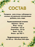 Говядина, мясо птицы, субпродукты мясные, натуральная желирующая добавка, соль, вода.