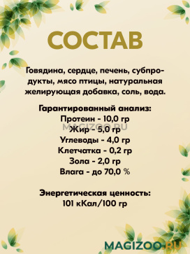 Говядина, сердце, субпродукты, мясо птицы, соль, вода.