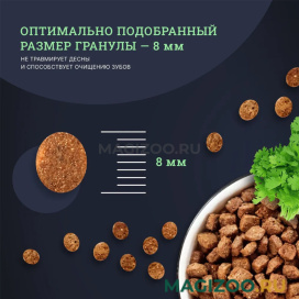 В основе рациона лежит легкоусваиваемое мясо цыплёнка. Благодаря входящим в состав пребиотикам, активизирует рост полезных бактерий, предотвращает дисбактериоз. Нерастворимая клетчатка стимулирует работу кишечника, поглощает и выводит оз организма шлаки и токсины.