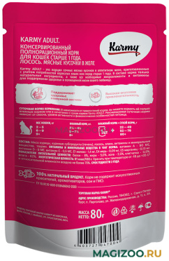 Karmy Adult - это порция сочных рыбных кусочков в аппетитном желе, приготовленных с учетом индивидуальных потребностей взрослых кошек всех пород старше 1 года.