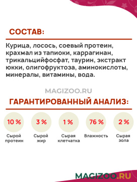 Полнорационный корм для кошек. Нежные кусочки с лососем и курицей в аппетитном соусе. Содержит пребиотики для улучшения пищеварения.