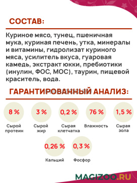 Куриное мясо, тунец, пшеничная мука, куриная печень, утка, минералы и витамины, гидролизат куриного мяса, усилитель вкуса, гуаровая камедь, экстракт юкки, пребиотики (инулин, ФОС, МОС), таурин, пищевой краситель, вода.