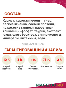 Курица, куриная печень, тунец, легкие ягненка, соевый протеин, крахмал из тапиоки, каррагинан, трикальцийфосфат, таурин, экстракт юкки, олигофруктоза, аминокислоты, минералы, витамины, вода.