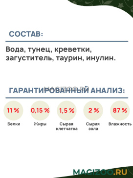 Вода, тунец, креветки, загуститель, таурин, инулин.