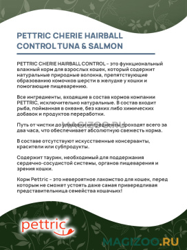 PETTRIC CHERIE HAIRBALL CONTROL – это функциональный влажный корм для взрослых кошек, который содержит натуральные природные волокна, препятствующие образованию комочков шерсти в желудке у кошки и помогающие пищеварению.