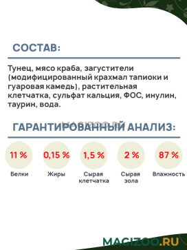 Тунец, мясо краба, загустители (модифицированный крахмал тапиоки и гуаровая камедь), растительная клетчатка, сульфат кальция, ФОС, инулин, таурин, вода.