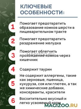 - Помогает предотвратить образование комков шерсти в пищеварительном тракте.